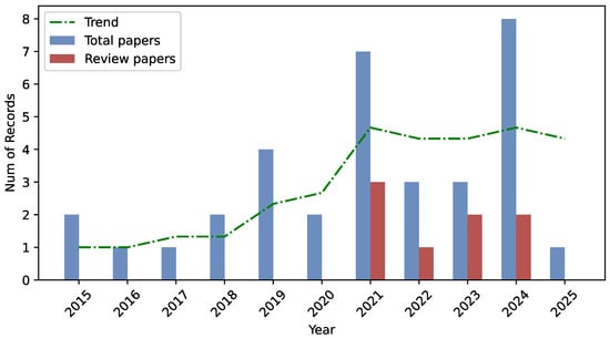 Bar plot depicting the annual distribution of document counts for all the included records (blue) and review articles (red). The dotted line indicates the temporal trend over the study period.