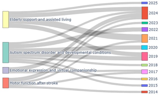Figure 5 illustrates the comparative distribution of studies across four main application domains over the examined years. The main patterns highlighted in Figure 5 refer to both the proportional distribution of research across domains and the temporal evolution of studied areas, emphasizing the dynamic progression of AI and HCI integration within OT. Furthermore, by paying careful attention, the reader can observe that research related to ASD and developmental conditions has maintained a consistent presence between 2015 and 2022, indicating sustained scientific interest in these areas. In contrast, studies focusing on elderly support and AL show a pronounced increase from 2021 onwards, reflecting the growing societal need to address challenges associated with aging populations. In addition, emotional expression and virtual companionship appear to be more recent research focuses, with most studies published between 2024 and 2025 suggesting an emerging recognition of technology’s role in supporting emotional well-being. Research on motor function rehabilitation after stroke appears more sporadically distributed, with studies emerging in 2014, 2017, 2023, and 2024 indicating ongoing but less concentrated efforts in this area.