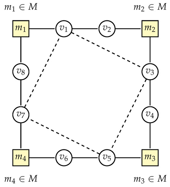 Proof. Let us assume by contradiction that the lemma’s assumptions are satisfied, but . From our assumption, we know that m has a degree of at least 4 (). Furthermore, from Lemma 9, we know that in bunch B there exists a vertex such that and u is adjacent to . Moreover, u is adjacent to a vertex v such that . According to the definition of phase 1 of the algorithm, vertex u with degree 2 selects vertex with the smallest ID among vertices with the highest degree in its closed neighborhood .