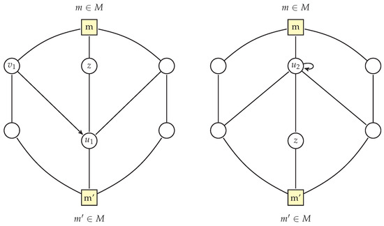 Since from our contradiction assumption we know that , vertex u cannot select vertex as , and, thus, will not be added to . Otherwise, m would be dominated and would not select any vertex as in phase 2 of the algorithm. We obtain a contradiction with the lemma’s assumption, which completes the proof. □