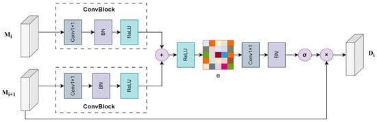 Next, the following steps are taken: perform a 1 × 1 convolution, BN (batch normalization), and sigmoid activation operation on the fused feature α, map the feature values to the [0, 1] interval, generate a spatial attention weight map, and multiply the attention weight map element by element with the initial , so that the multiplied feature map can assign higher weights to key regions in low-level feature maps based on the semantic information contained in high-level feature maps, improve the ability to capture important features, and suppress the interference of irrelevant information. The calculation steps of can be summarized using Equation (2) as follows: