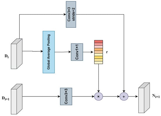 The FNRM gradually enhances from the lowest level to through 3 BEBs (boundary enhance blocks), as shown in Figure 3. Each BEB first conducts global average pooling (GAP) on to reduce its spatial dimension to 1 × 1, and then uses a 1 × 1 convolution to obtain the channel weight information . Next, it peforms a 3 × 3 convolution operation on to map it to the same number of channels and conducts point-wise multiplication with the weight information to obtain . In this way, the noise information in the feature maps is cancelled out to reduce the model’s sensitivity to noise. Finally, is added to after a 3 × 3 convolution operation with a stride of 2 to finally output . The composition of BEB is shown in Figure 4, and this process can be represented by Equations (3) and (4).