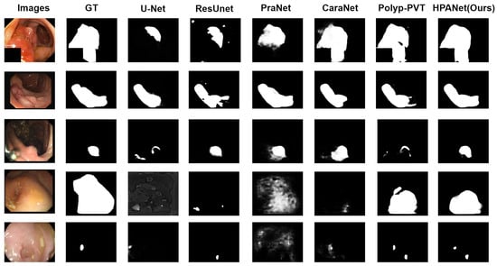 To verify the segmentation performance of the HPANet for polyps in different scenarios, based on the experimental results in Section 4.2 and Section 4.3, five representative imaging scenes were selected from five datasets to observe the segmentation results, with the segmentation outcomes visualized in Figure 5. The image (Row 1, Column 1) demonstrates large polyps with partial blurred margins. Conventional segmentation models (U-Net, ResUnet, PraNet) exhibit incomplete localization of polyp margins, while CaraNet and Polyp-PVT generate boundaries with reduced sharpness. In contrast, the proposed HPANet can accurately locate the polyp and produce clear and complete segmentation boundaries. The image (Row 2, Column 1) was selected from the CVC-ClinicDB dataset, where the polyps exhibit adhesions but have relatively clear boundaries. Compared to the other five models, the HPANet matches the manually annotated results very well in terms of overall shape and position, and the segmentation boundaries are also smoother. The image (Row 3, Column 1) selected from the CVC-300 dataset is characterized by the presence of artifacts and glare caused by the camera’s movement in polyps. The U-Net and Polyp-PVT segmentation models may produce incorrect segmentation, while ResUnet, PraNet, and CaraNet can roughly locate the position of polyps, but artifacts may appear near the segmentation boundary. The image (Row 4, Column 1) is from the CVC-ColonDB dataset. The contrast between the polyps in this image and the surrounding mucosa is low, leading to segmentation errors in U-Net, ResUnet, PraNet, and CaraNet, while Polyp-PVT and HPANet only show a certain degree of under segmentation. The image (Row 5, Column 1) is from the ETIS-LaribPolypDB dataset, where the proportion of polyps to the entire image is very small and there are interference factors such as yellow residues. The U-Net, ResNet, PraNet, and CaraNet models generate incorrect segmentation results, identifying background pixels as polyps, while Polyp-PVT and HPANet are also affected by interference factors, resulting in segmentation errors but with clear segmentation boundaries.