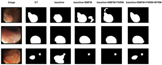 To systematically validate the contributions of individual modules in the proposed framework, an ablation study was performed on the Kvasir dataset. The quantitative results are shown in Table 3, where the symbol “×” indicates the cancellation of the module and “√” indicates the activation of the module. The visualization results of the ablation study are shown in Figure 6. From Table 3, it can be seen that the integration of the BMFM improved the baseline model’s mIoU from 0.8392 to 0.8455 (+0.63%), mDice from 0.8955 to 0.9004 (+0.49%), and recall from 0.9061 to 0.9207 (+1.84%). These enhancements demonstrate the ability of BMFM to aggregate multi-scale spatial features, which is particularly important for maintaining fine-grained object boundaries in complex segmentation scenes. For example, the hierarchical feature fusion mechanism of this module improves the accuracy of boundary localization by adaptively weighting low-level texture details and high-level semantic context.