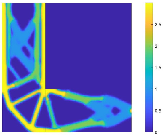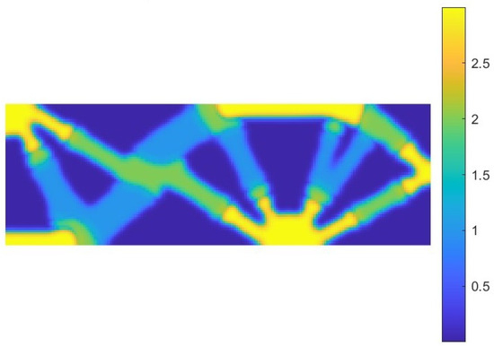 The optimal topology at convergence obtained using the SISO model is shown in Figure 19. In the visual representation, blue, green, and yellow correspond to the materials with , , and , respectively. As previously observed, the components of the multi-material structure exhibit varying thicknesses, with stiffer materials typically forming thinner, more localized features.