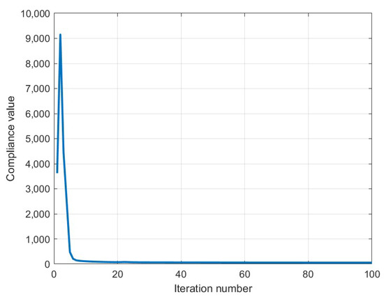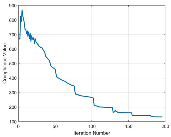 This behavior is closely tied to the nature of the 2-norm, which corresponds to the largest singular value of the transfer matrix and thus emphasizes the most critical input/output direction in terms of energy transfer or compliance [27]. Consequently, the optimization process concentrates design efforts on stiffening the dominant deformation mode, allocating stronger materials to regions of peak stress—namely, the vertical load-bearing chords and the reentrant corner, which is known to be subjected to significant stress concentrations (and therefore strains, and displacements). To conclude, Figure 22 depicts the convergence curve obtained during the optimization.