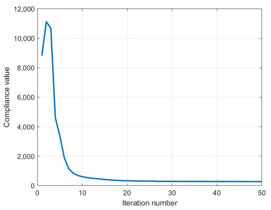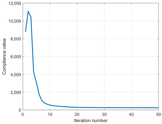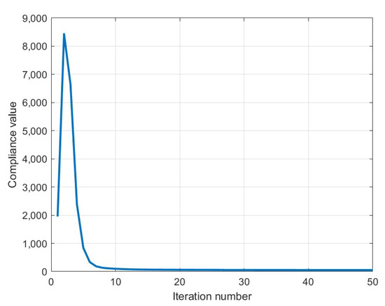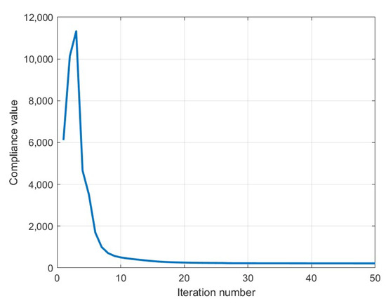 To assess the performance of the optimization algorithm, Figure 20 presents the evolution of the objective function over the course of the optimization. Although a total of 50 iterations were executed, convergence was effectively achieved after approximately 25 iterations, demonstrating the efficiency of the Method of Moving Asymptotes in this context.