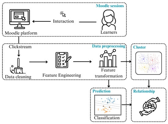 Moodle, a popular open-source LMS, logs a wide range of user activity, referred to as clickstream data. This data captures interactions within the platform, including page visits, resource views, forum posts, and various other actions []. However, these raw data are not directly suitable for predictive modeling and must first be transformed into a more structured format for analysis []. Below, we provide a brief overview of the key Moodle database tables that store this user activity data.