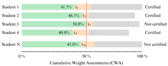 For better clarity, Figure 2 provides an illustrative example of the CWA progression for several students. By the end of the course, there is variability in student completion rates, with some students finishing all assessments (100% completion) and others not, as well as differences in certification outcomes, with some students receiving a certificate of participation and others not. In this example, is set to 50%, and each student’s FATP is determined individually based on when their CWA reaches or remains below this threshold. For instance, Student 3 ’s FATP is set at when their CWA first reaches 50%. In contrast, for Student 4, the FATP is calculated at 40% CWA because their next evaluative assessment pushes their CWA beyond the 50% threshold.