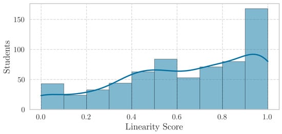 We quantify the degree of linearity of the student’s learning path through a Linearity Score computed over the 12 evaluative activities of the course. This score measures how closely a student’s assessment sequence follows an ascending order. A Linearity Score of 1 indicates perfect linearity, where a student completes the assessments in strictly ascending order from 1 to 12 or with repetitions while maintaining the ascending sequence (e.g., 1, 2, 2, 2, 3, 4, 5, 5, 5). In contrast, scores closer to 0 represent a lack of linearity, where the order of assessments appears disordered (e.g., 2, 5, 3, 6, 5). Figure 3 shows the distribution of the Linearity Score across students. We can see the diversity in how students resolve the course assessment, ranging from highly linear patterns (scores near 1) to highly disordered ones (scores near 0). This variability in assessment order reflects the self-paced, flexible nature of the course and highlights differences in how students approach the learning material [,]. The algorithm used to compute the Linearity Score is detailed in Algorithm A1.