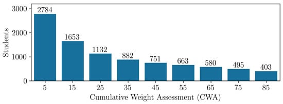 Figure 4 shows the distribution of the students according to the percentage of the overall course assessment they completed, highlighting a steep dropout rate from the beginning of the course. In this context, “early stages” refers to the first completed evaluative activities, since students can follow the course in any order. Many students disengage before reaching 5% of the Cumulative Weight Assessment (CWA); among those who reach 5%, more than half drop out before completing 25% of the assessments, with a particularly sharp decline observed between the 5% and 20% CWA. This early dropout pattern emphasizes the importance of developing predictive models to accurately identify at-risk students in the initial phases of the course.