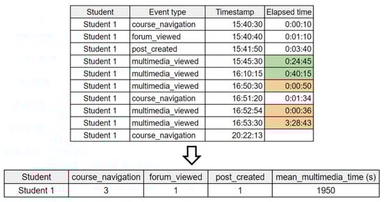 Figure 5 shows an example of feature aggregation for Student 1, who engaged in various platform activities. Interactions such as course_navigation, forum_viewed, and post_created are aggregated as the total number of interactions. Additionally, Student 1 accessed multimedia resources, but outlier data points, such as unusually long or short viewing times, were removed. The remaining data points were used to calculate the mean time spent on multimedia resources, representing the student’s productive engagement with educational content.