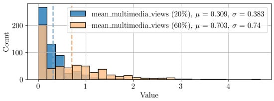 As noted in Section 3.2.2, we updated the features until a student’s was less than or equal to a given threshold. The distribution of each feature evolves as the threshold increases. For example, Figure 6 shows the distribution of the mean_multimedia_views feature for two different thresholds. As expected, increasing the threshold from 20% to 60% resulted in a broader distribution with higher mean and variance values.