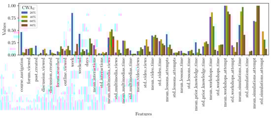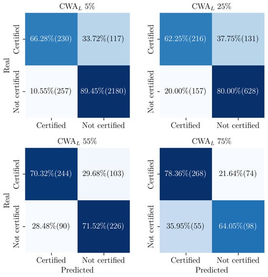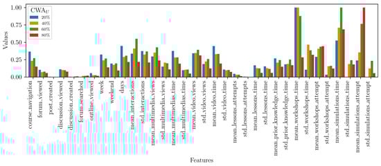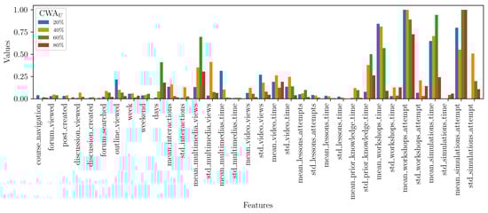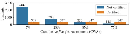 For the analysis, we defined as the lower bound for selecting students. In other words, the final dataset used in our experiments included students who achieved a CWA equal to or greater than . Figure 7 shows how the total number of students and the class distribution (certified vs. not certified) changed with . With a threshold of 5%, 2437 students did not achieve certification (), and 347 did (), resulting in an imbalanced dataset. Using that threshold would have included students with limited interaction on Moodle, which could have led to noisy data. In contrast, when we increased to 75%, the dataset contained students with substantial interactions but fewer samples: 148 students who did not achieve certification () and 347 who did (), maintaining imbalance and potentially filtering out important early-stage dropout patterns crucial for identifying at-risk students.