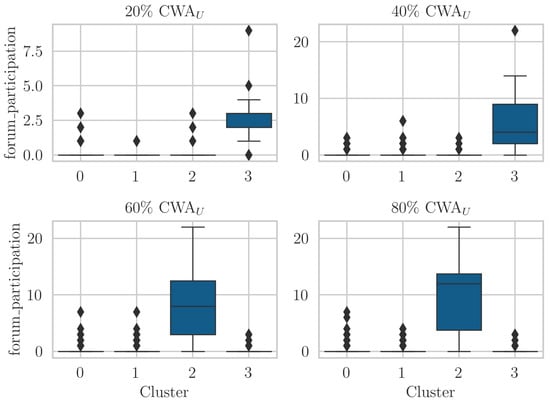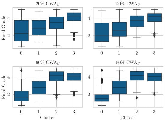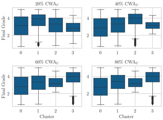 This section presents experiments on the data described in Section 3.6. Since we are interested in early student performance prediction, we use four distinct Cumulative Weight Assessment upper thresholds (): 20%, 40%, 60%, and 80% in all of our experiments, for both classification and clustering. These thresholds divide the course into progressive stages, helping us better interpret how student performance and learning patterns evolve. The 20% and 40% thresholds represent early engagement, critical for identifying students needing timely support. The 60% and 80% thresholds reflect later stages of the course, allowing us to evaluate how predictive performance improves as more data becomes available. All code was implemented in Python 3.10.9 using the scikit-learn library [].