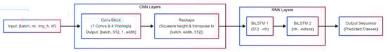 For the purpose of date recognition, an adapted convolutional recurrent neural network (CRNN) [] is employed, known for its effective application in recognizing handwritten text. This is because it captures spatial features of characters and the sequential flow of text efficiently. Initially, the pretrained model undergoes fine-tuning with a dataset that comprises a variety of characters, including uppercase, lowercase, and diverse symbols commonly found in dates.