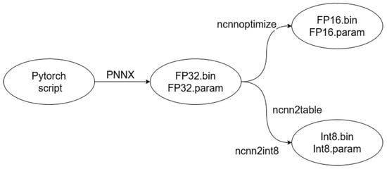 NCNN is a high-performance neural network inference computing framework optimized for mobile platforms []. This research employed the NCNN framework to quantify the model and construct a real-time expiration date identification and character recognition application utilizing the quantized model. Figure 4 illustrates the quantization procedure.