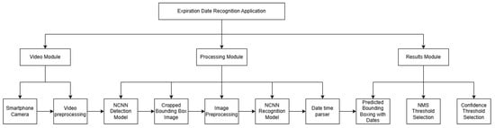 The expiration date real-time recognition application created in this study is composed of three main components (Figure 5): the video acquisition module, the processing module, and the result display module. The video acquisition module uses the smartphone’s camera to capture food packages in real time; the processing module inputs these video streams into the detection model frame by frame while keeping the resolution size of the image fixed at , and the detected area is cropped out; then, it preprocesses the cropped image and sends it to the recognition model; after the recognition receives the correct date, the date time parser tries to transform the date format into a unified format; the result display module then shows the predicted bounding boxes and the parsed characters in real time, providing the non-maximum suppression (NMS) threshold bar and the confidence threshold bar to adjust in the expiration date recognition app developed in this research. As shown in Figure 6, the app’s overall interface features an image with working unit CPU or GPU of the smartphone, the size of the image, the inference time, frames per second (FPS), and the average FPS. Users can adjust the NMS threshold bar and the confidence threshold bar to change how the detected area would be shown on the interface.