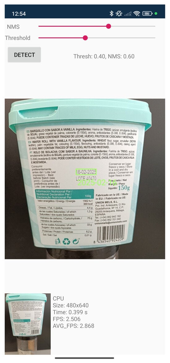 In conclusion, this work has demonstrated significant advancements in the recognition and interpretation of expiration dates on product packages, emphasizing the importance of model optimization for edge devices. Among the tested models, the FP16 configuration strikes an ideal balance between performance, accuracy, and energy efficiency, making it particularly suited for deployment in computationally constrained environments. Furthermore, the proposed method’s ability to process a wide variety of date formats and adapt to computational limitations showcases its practicality and versatility. We are particularly grateful to ONCE (Organización Nacional de Ciegos Españoles), the Spanish National Organization of the Blind, for suggesting this concept to us. We intend to carry out evaluations to guarantee the fundamental accessibility of our solution.