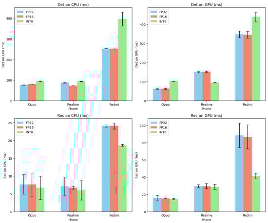 Figure 8 shows the different quantized detection and recognition models run 100 times to obtain the mean inference time and the standard deviation.