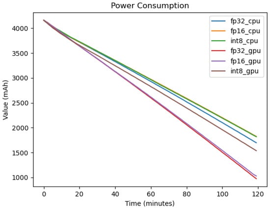 As Figure 9 shows, the energy consumption of the application on the Oppo phone reflects its previous performance. The phone is set in flight mode, and the brightness is at maximum while the application is working without any other applications in the background, and the remaining battery energy is recorded every 1 min starting from 100% battery energy, continuously working for 2 h. While the controlled conditions might represent a worst-case or idealized scenario, they serve as an essential baseline for comparing the relative energy efficiency improvements across different model configurations and quantization strategies. Future work will extend these evaluations to more realistic usage conditions; however, establishing a baseline under standardized conditions is a critical step for isolating the performance characteristics of the methods under investigation. The FP32, FP16, and INT8 models are tested in CPU and GPU modes, respectively. In CPU mode, the FP16 model and INT8 model almost consume the same energy, while there is a huge energy drop in GPU mode compared to the same model. Additionally, the INT8 model suffers a significant drop in accuracy after quantization. To take into account the battery of the phone and the accuracy of the model, it is recommendable to use the FP16 model in CPU mode.