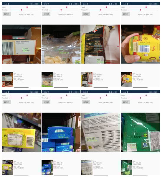 Figure 10 shows how the proposed work recognizes the expiration dates in real time. All the images from Figure 10 are screenshots from the Redmi phone; the average FPS working in CPU mode is around 2. It shows feasibility on computationally constrained devices and a huge advantage in terms of power consumption.