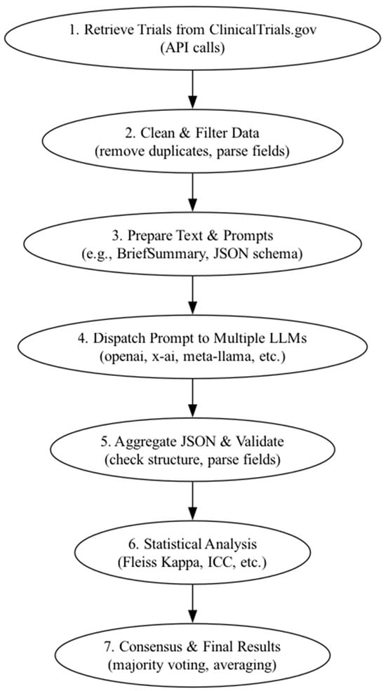 Following data cleaning and initial filtering, each trial’s BriefSummary or DetailedDescription text was processed in parallel by the five LLMs. This multi-model approach leverages the unique strengths of each model while minimizing the impact of omissions or misinterpretations by any single LLM.