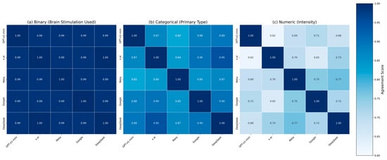 For nominal outcomes such as the specific stimulation modality (e.g., tDCS, TMS), we computed Fleiss’ kappa to assess overall agreement among all five models. For numeric parameters, we employed ICC(2,1) (a single measure) or ICC(2,k) (average measures), in line with standard multi-rater reliability approaches in clinical and behavioral research.