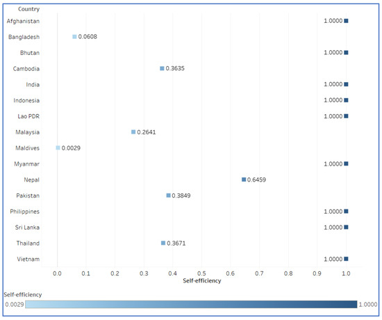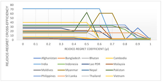 Ultimately, the rejoice–regret cross-efficiency of DMU can be calculated according to Equation (10). Figure 5 presents the results with and The results for renewable energy investment efficiency in South and Southeast Asian countries paint a fascinating picture of how efficiently these nations are harnessing their resources to drive sustainable energy development. As shown in Figure 6, India stands out prominently with the highest cross-efficiency score, emphasizing its remarkable ability to allocate resources efficiently for renewable energy investments. This top-ranking performance highlights India’s pivotal role as a regional leader in the pursuit of sustainable energy sources. Pakistan, closely following India, also distinguishes itself with a strong cross-efficiency score, underlining its commitment to sustainable energy development. Pakistan’s notable performance reinforces its position as one of the top-performing countries in the region in terms of RE investment efficiency. Indonesia’s presence in the top tier further underscores its significance in the regional renewable energy landscape. Its third-place ranking reflects a commitment to optimizing resource allocation for renewable energy projects and contributes to the broader sustainability efforts in the region.