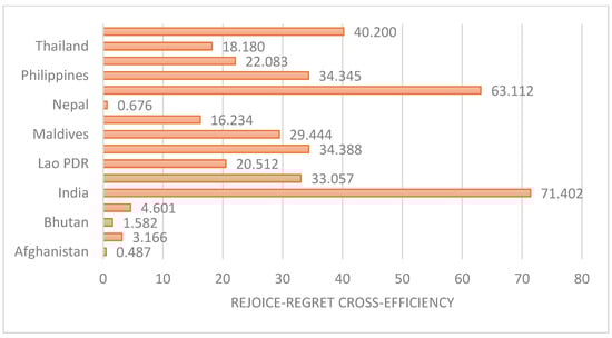 Among the highlighted nations, several, including Afghanistan, Bhutan, Indonesia, Myanmar, Lao PDR, the Philippines, India, Sri Lanka, and Vietnam, exhibit exemplary self-efficiency scores of 1, signifying optimal resource utilization in their renewable energy investments. These countries have effectively balanced inputs and outputs, ensuring that their efforts yield maximum returns in terms of renewable energy generation and sustainability. In contrast, countries like Bangladesh, Malaysia, the Maldives, Pakistan, and Thailand display varying degrees of lower self-efficiency, indicating potential opportunities for enhancing their resource allocation strategies for renewable energy projects. Thus, in this step, two groups are identified as efficient and non-efficient groups. However, to determine the specific rankings under the influence of psychological behavioral factors, the rejoice–regret cross-efficiency of the countries is calculated in the following section.