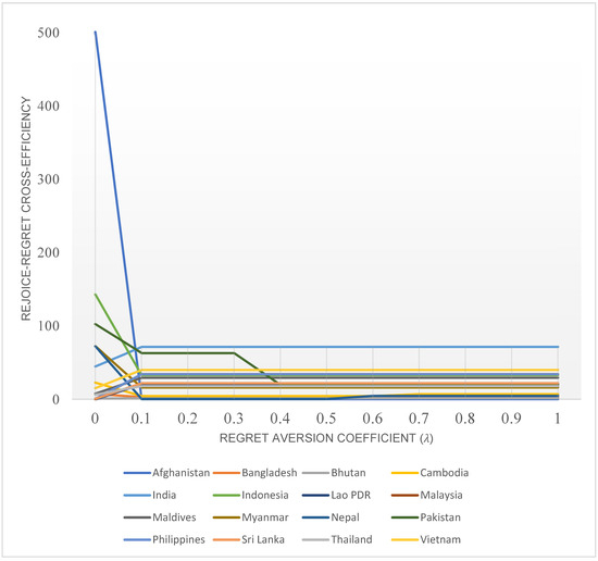 The objective of this section is to clarify how psychological behavioral coefficients impact the results of cross-efficiency assessment in the RRUCE DEA model. For this purpose, the RRUCE model will be solved iteratively for different values of regret aversion coefficient and equally rejoice–regret coefficient . Firstly, with , the rejoice–regret cross-efficiency is calculated with different values of . As illustrated in Figure 7, the results show that the regret aversion coefficient has almost no significant impact on rejoice–regret cross-efficiency except when it reaches a value of 0. In other words, only when the decision maker has absolutely no regrets in the decision-making process will the evaluation results of the RRUCE model exist with significant differences. This demonstrates the ability of the RRUCE DEA model to reflect whether or not the decision maker is regret-averse.