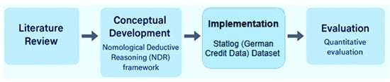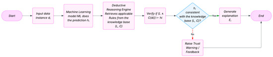 The conceptual design of the NDR framework was informed by a structured literature review of XAI methods published between 2010 and 2024, conducted in accordance with PRISMA guidelines. The review focused on explanation formats, logical structure, and epistemic soundness, emphasizing the importance of producing explanations that are not only interpretable but also grounded in valid reasoning [31,32]. The analysis revealed a prevailing reliance on post hoc and correlation-based interpretability techniques, which often lack formal causal justification. In response, the NDR framework was developed to integrate statistical predictions with symbolic deductive logic, guided by Hempel’s deductive–nomological (D-N) model. In this approach, AI outputs must be derivable from a structured knowledge base of domain-specific rules and antecedent conditions, embedding explainability directly into the reasoning process.