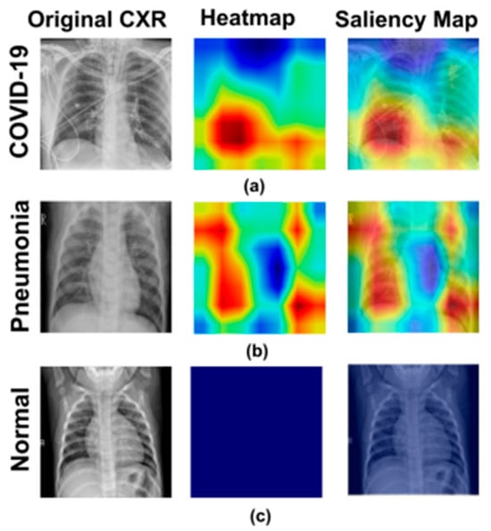 Chest X-ray examples labeled as (a) COVID-19, (b) Pneumonia, and (c) Normal. Each row (from left to right) shows the input image, AI prediction, and Grad-CAM heatmap. Highlights reflect regions influencing the model’s decision. Source: [43].