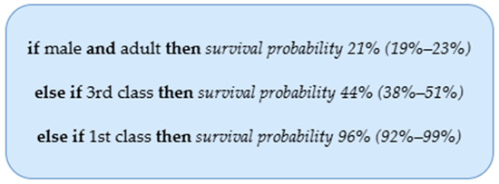 Rule-based explanations are a popular type of explanation technique in data mining, machine learning and Artificial Intelligence by which regularities in data are identified through various rule-extraction techniques. These regularities are mostly presented in the form of the IF-THEN rule, sometimes with AND/OR operators, as illustrated in Figure 4, which is an example decision list that was created using the Titanic data set available in R for the task of predicting whether the passenger survived the Titanic tragedy based on his or her features, such as age (adult or child), gender (male or female), passenger class (first, second, third, or crew) [63]. The “if” statements express a set of features comparable to the model’s inputs, and the “then” statements correspond to the predicted outcome corresponding to the conditions stated by “if”.