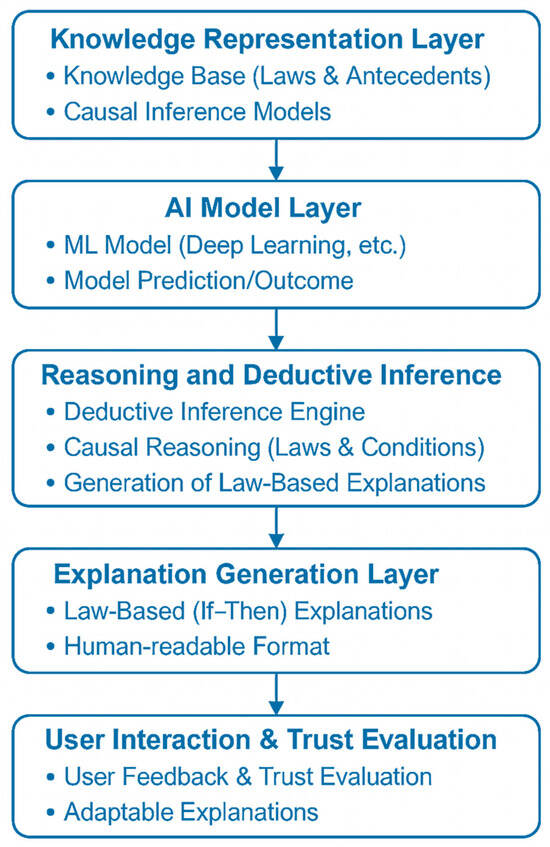 The proposed NDR framework comprises five sequential layers: (1) knowledge representation, (2) the AI model, (3) reasoning and deductive inference, (4) explanation generation, and (5) user interaction and trust evaluation. Each layer contributes to generating rule-consistent, human-readable justifications grounded in domain knowledge.