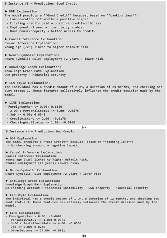 Each prediction produced by the classifier was evaluated by the NDR deductive engine. This component queried a formalized financial knowledge base containing symbolic rules such as: “Loan duration > 12 months indicates credit stability” or “Multiple debtors suggest increased financial risk”. The engine determined whether the prediction followed logically from the rules and, if so, generated a corresponding explanation.