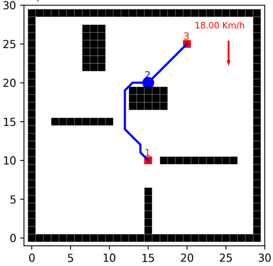 Figure 1 shows two trajectories: one from node 1 to node 2 and another from node 2 to node 3. These trajectories are located on a 30 × 30 km grid. The following factors influence the UAV’s trajectory: (i) UAV speed—the UAV maintains a constant speed along the entire trajectory (km/min); (ii) wind speed and direction—wind velocity (km/min) and direction (radians) are considered as environmental factors, which can increase or decrease the UAV’s effective speed depending on the trajectory; and (iii) payload weight—the weight (kg) of sensor equipment and other devices mounted on the UAV, which are necessary for performing operations at each location.