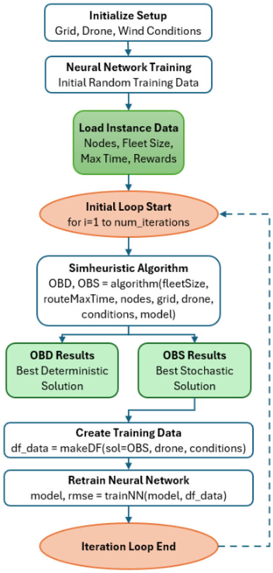 After initialization, the system loads instance data from input files detailing problem specifications. Each file includes parameters like the number of nodes (UAV points), fleet size (number of UAVs), and maximum route duration. The system extracts node locations and rewards, ensuring they do not conflict with obstacles. This converts raw descriptions into structured data for route planning algorithms, defining the optimization challenge. At the core of our methodology lies an iterative optimization and learning process. Each iteration executes our simheuristic algorithm to generate two solutions: OBD (our best deterministic solution) and OBS (our best stochastic solution). The system then extracts operational data from the OBS to retrain the neural network model, improving travel time prediction accuracy. This feedback loop between optimization and learning represents a key innovation—the system progressively learns from its own results, creating increasingly reliable UAV routing solutions with each iteration. Rather than treating travel time estimation as static, we continuously refine it throughout the solution process, enhancing route quality as the neural network adapts to operational realities.