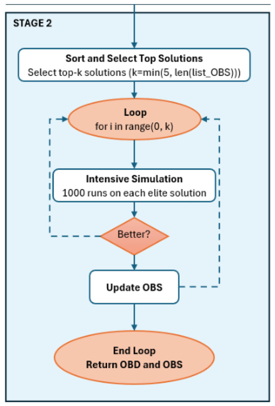 As shown in Figure 5, Stage 2 refines the most promising stochastic solutions to determine our best stochastic solution (OBS). First, the algorithm sorts all candidate solutions in by their simulated reward values and selects the top-k solutions, where k is the minimum between a predefined maximum (5) and the total number of candidates. Each of these elite solutions undergoes a more intensive Monte Carlo simulation with 1000 runs to more accurately assess its performance under uncertainty. The solution that demonstrates the highest reward after this intensive simulation becomes the final OBS.