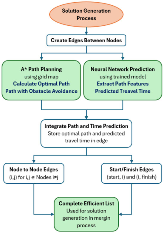 A critical aspect of our methodology lies in the integration of the A* algorithm and neural network predictive modeling during the solution generation process. As illustrated in Figure 6, for each potential edge between nodes in our problem, we employ a two-step approach to determine both the optimal route and its expected travel time. First, the A* algorithm calculates the optimal path between nodes while ensuring obstacle avoidance. Operating on our 2D grid-based environment representation, A* efficiently explores the state space to determine the shortest feasible path between any two nodes. This process is essential for ensuring UAV routes remain physically viable in environments with obstacles. Simultaneously, our neural network model predicts the travel time for each path segment. The network takes as input multiple features including UAV speed, path distance, trajectory angles, wind conditions (speed and direction), and payload weight. These predictions account for the complex interplay of environmental factors that impact UAV performance beyond mere distance considerations.