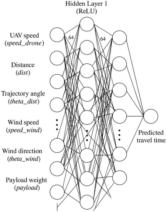 The network consists of three fully connected hidden layers (Figure 7): layer 1 with 64 neurons, layer 2 with 64 neurons, and layer 3 with 32 neurons. Each layer uses the ReLU activation function to introduce nonlinearity. The final layer produces a single value representing the estimated travel time for the segment. The network contains approximately parameters, balancing learning capacity and computational efficiency. For each segment in an A*-generated path, the actual travel time is computed using the physical model. The dataset includes UAV speed, segment distance, angles, wind conditions, and payload weight.