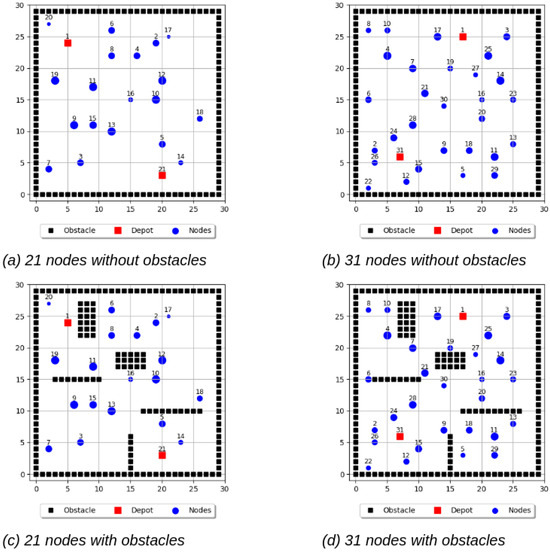 Two primary instance sets were created to evaluate the proposed approach: one comprising 21 nodes and another with 31 nodes. For each instance set, scenarios with and without obstacles were considered to assess the impact of obstacle avoidance on route optimization. Figure 8 illustrates the spatial distribution of nodes, obstacles, and depots for both instance sets.