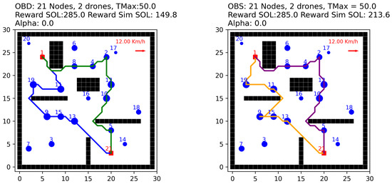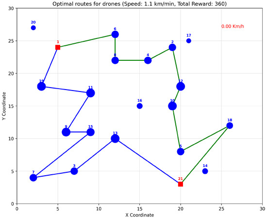 To establish a performance baseline, we solved the simple version of the problem (without obstacles or environmental factors) using Gurobi, a commercial optimization solver. Two different instance sets were considered: a 21-node instance with two UAVs and a 31-node instance with three UAVs. For the 21-node instance with two UAVs, each with a speed of km/min and a maximum route duration of 50 min, the solver identified an optimal solution with a total reward of . Figure 9 illustrates the optimal routes identified by Gurobi.