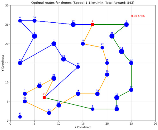 For the more complex 31-node instance with three UAVs, each with a speed of km/min and a maximum route duration of 50 min, Gurobi found an optimal solution with a total reward of . Figure 10 illustrates these optimal routes.
