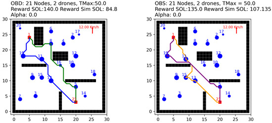 Our best solution (OBD) for this variant with obstacles is as follows: route 1 = [1, 11, 19, 9, 15, 13, 21], with reward = 145.0, and travel time = 49.54 min; and route 2 = [1, 8, 4, 2, 12, 10, 5, 21], with reward = 140.0, and travel time = 49.82 min. The total reward was .