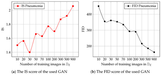 Before starting the Algorithm selection evaluation, we evaluate the performance of the data generator networks. Figure 5a,b show two common measures used to asses the quality of generated images. Figure 5a shows the Inception Score (IS) measure [53] applied to the pneumonia synthetic images generated by the used GAN. The IS metric is used to assess how sharp and distinct the generated images are. IS is calculated using the Inception v3 [54] pretrained image classification model applied to images generated by GAN. The score is maximized when two conditions are met. The first condition is high confidence in the label assigned to each image, indicating image sharpness. The second condition is the variety of the labels assigned to different images, indicating a high diversity of the generated images. Figure 5b shows the FID score. The FID score [52] is a measure of the distribution of the synthetic images when compared to the distribution of the real images. In particular, the covariance and the mean of the synthetic distribution of images are compared with the distribution parameters of the real images.