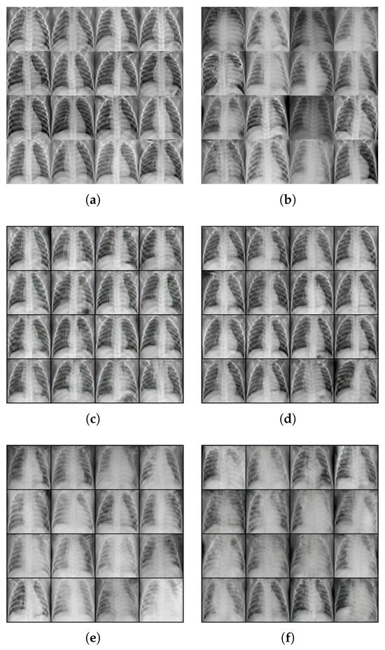 Example images used for our experiments. (a,b) real images; (c,d) synthetic images for healthy subjects; and (e,f) synthetic images for patients with pneumonia. (a) Example of real X-rays of healthy subjects; (b) Example of real X-rays of patients with pneumonia; (c) example of synthetic X-rays for healthy subjects (highest FID score); (d) example of synthetic X-rays for healthy subjects (highest IS score); (e) example of synthetic X-rays for patients with pneumonia (highest FID score); (f) example of synthetic X-rays for patients with pneumonia (highest IS score).