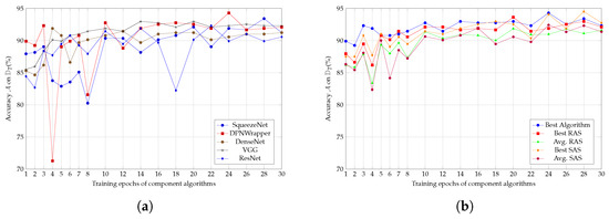 In Figure 10a, the more the Algorithms are specifically trained to the dataset, the more they converge to individual accuracies with reduced variation. It can be concluded that that the component Algorithms’ complementary performance becomes less relevant due to Algorithm relative overfitting or training. By relative overfitting, we mean that an Algorithm’s accuracy tends to a much lower variance by matching the training dataset more and more precisely. In other words, as the performance overlap becomes larger, the Algorithm selection converges to select Algorithms with diminishing effect of improvement. Note that when component Algorithms are trained for one epoch, the difference in the average accuracy is larger than , while, when trained for 30 epochs, their relative accuracy difference is <. In addition, their relative accuracy increases from the interval [84%–90%] at epoch 1 to [91%–93%] at 30 epochs. In addition, note that the highest and lowest accuracy of classification was achieved for 24 training epochs and for 4 training epochs by the DPN.