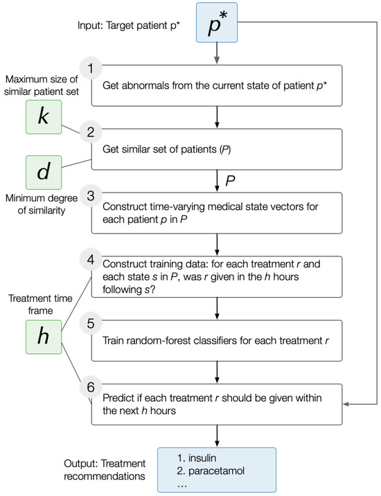 - Train a set of independent treatment classifiers, one for each treatment r in the set of treatments, ℞, administered to any patient in this set of relevant patients (Section 3.3 and Section 3.4). Each classifier applies to the state of each patient p in from the time of admission () to any later time (). The classifier for treatment r is trained based on whether r was given within a time horizon of h hours after t or not.