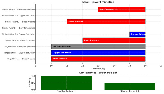 Measurement timeline and resulting example of similarity scores. Upper panel: timelines for the target patient and two candidate similar patients over a 9–17 h window. Each colored bar denotes an abnormal measurement episode: red = high abnormal, blue = low abnormal, grey = normal. Lower panel: degree of similarity d to the target patient. Similar Patient 1 shares both high bp and low O2, yielding ; similar Patient 2 matches only , so .
